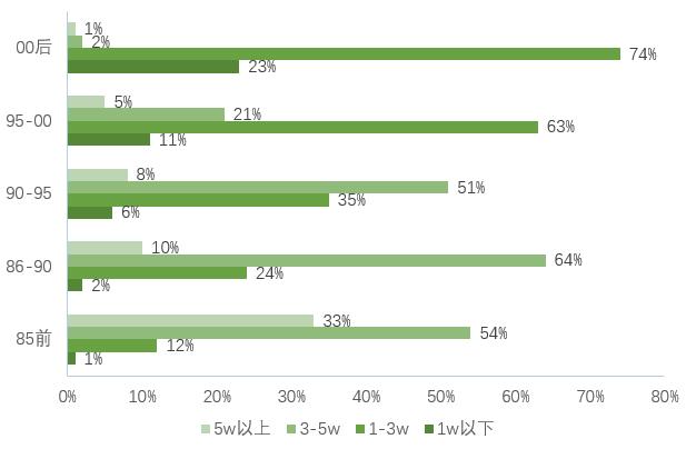 拥有工作经验的程序员薪酬水平更高。在95年-00年出生的程序员中,1-3万元月薪的比例下降至63%,21%的程序员月薪冲到3-5万元。程序员看重职场经验和资历,85年前的程序员已成为社会中坚力量,大多晋升到中高管或者技术骨干位置,33%的程序员月薪达到5万元以上。