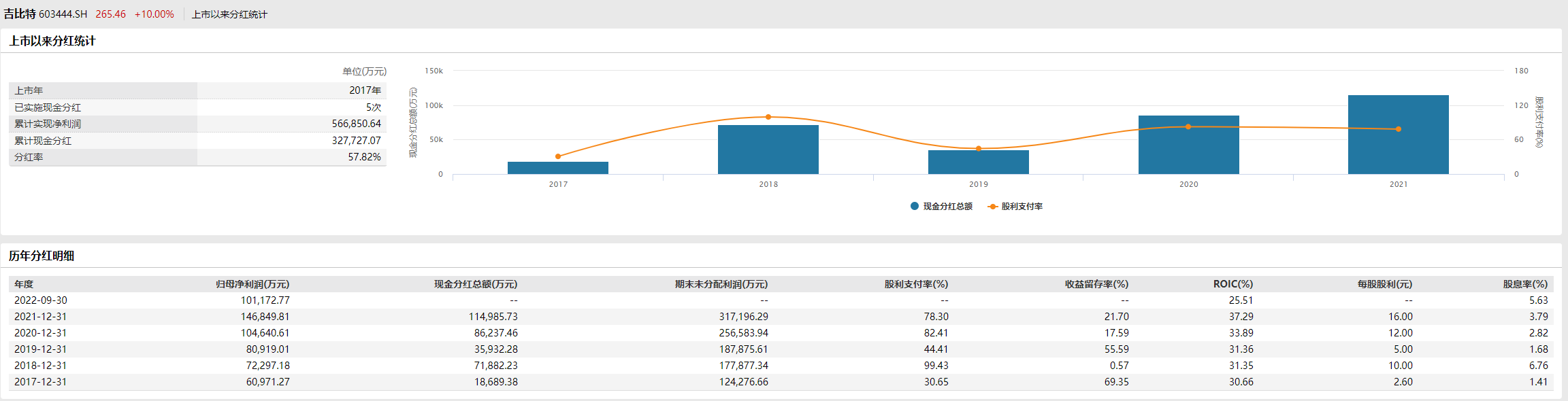 受此影响,10月27日吉比特股价涨停,截至收盘,报收265.46元/股,市值191亿元。对于为何考虑如此大手笔地分红,新京报贝壳财经记者以投资者身份致电吉比特证券部,工作人员表示,分红是为了更好回馈投资者,分红的金额是充分考虑了公司未来可持续发展所需资金后的决定。