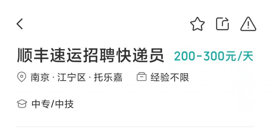 顺丰也开始通过互联网渠道发布2000人招聘公告,提升单件派费,可就近分配。在某招聘平台,一则顺丰速运招聘信息显示,招聘快递员200-300元/天。招聘人员告诉记者,工资具体按件计算,一件2.5元,工资月结,工作时间一般是早上7点半到晚上8点。现在马上到最忙的时候了,500单以上会有额外奖励,188元-588元不等。对方表示,这个招聘长期有效。江苏顺丰速运有限公司副总经理李世里介绍,顺丰已拓宽招聘渠道,制定了完善的应对方案,人员基本可按照计划进行招聘、储备,以保障双11用工。