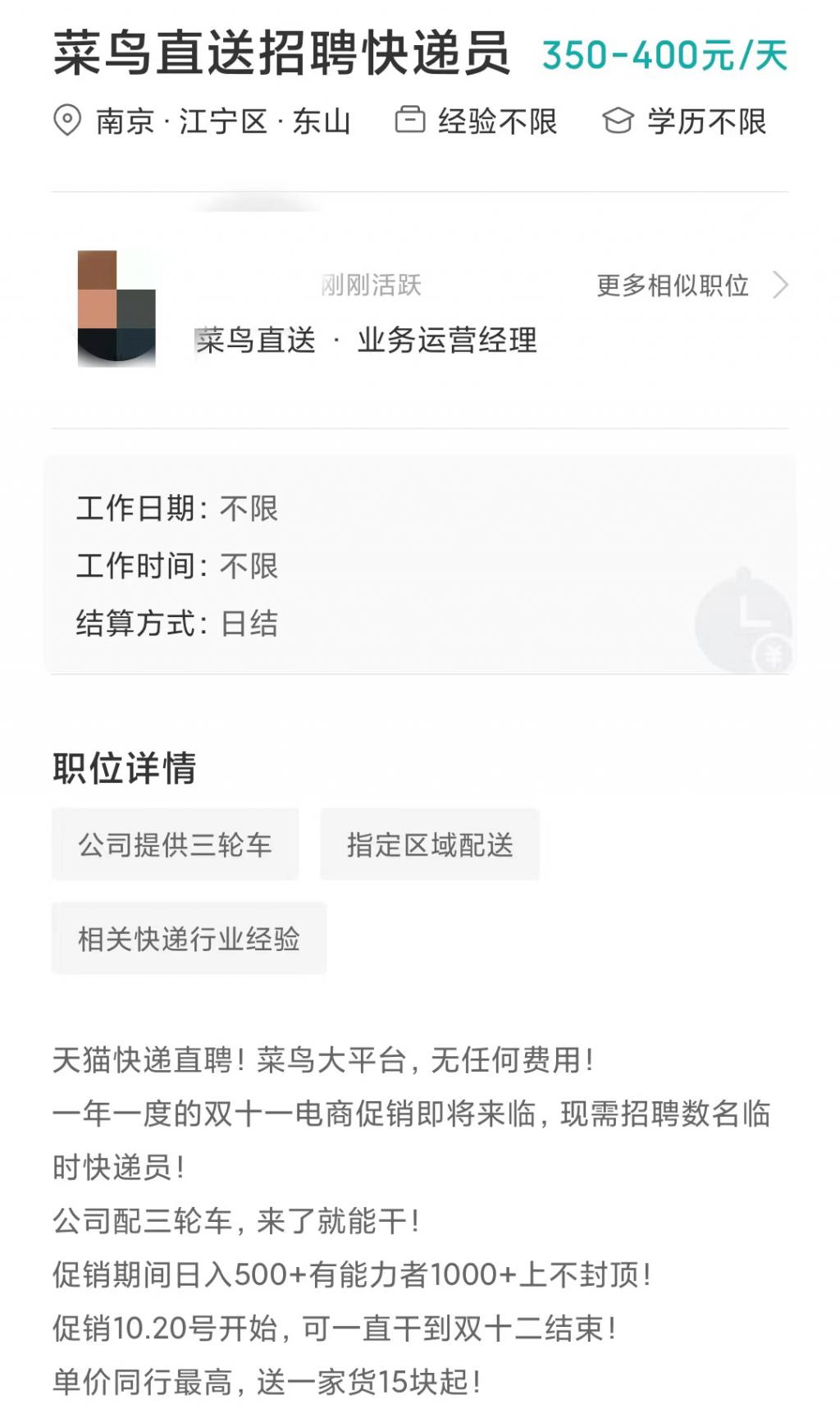 在南京阅景龙江国际公寓菜鸟驿站,站长王勇已经委托人力公司招聘配送员,直接开出了临时工保底30元/小时的条件。王勇表示:为了多招到人,已经加码了招聘工资,日常小时价是20元,临时工在‘双11’期间月入过万很常见,但也确实很累,现在已经招到了3个人,最近一直在和应聘者联系中。