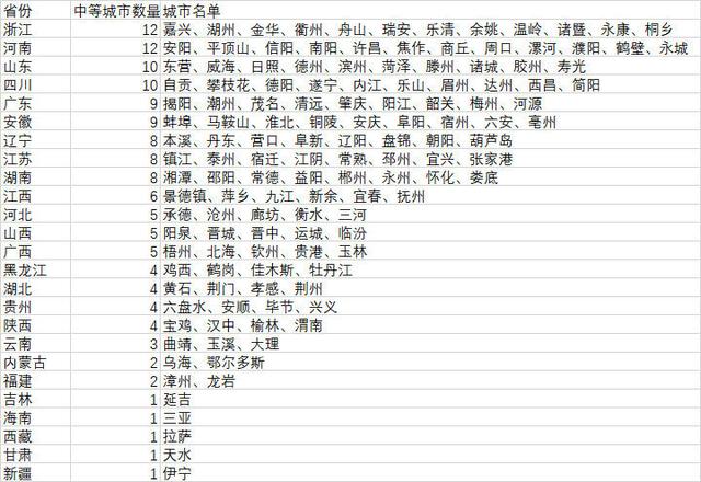 分省份来看,135个中等城市分布在25个省份。有4个省份的中等城市超过10个,分别是浙江、河南、山东和四川,均为人口超过6000万的人口大省。其中浙江和河南各有12个,山东和四川各有10个。