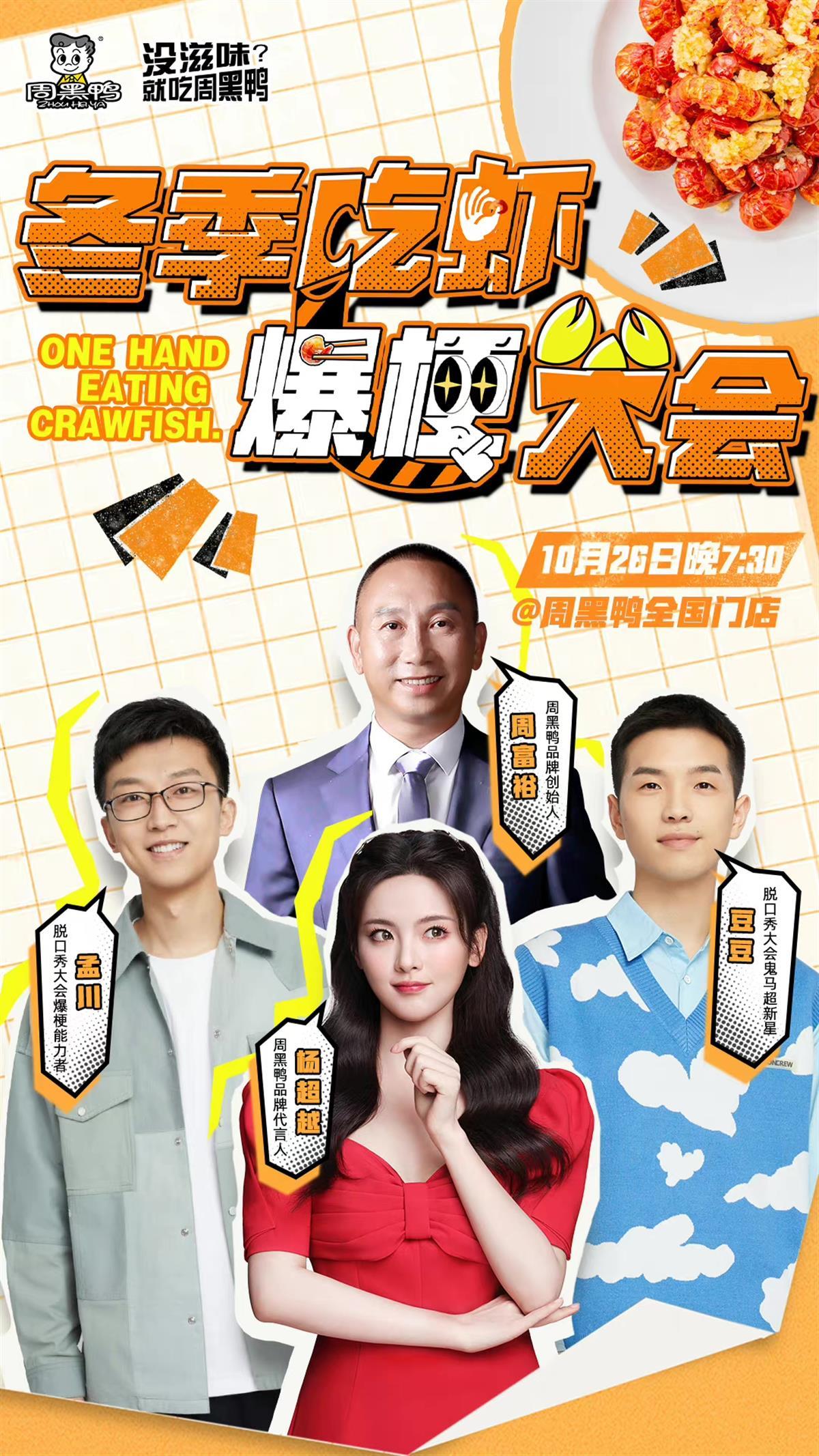 10月26日晚,《周黑鸭冬季吃虾爆梗大会》在周黑鸭抖音直播间火热开启,周黑鸭品牌代言人杨超越更是惊喜亮相,和周黑鸭品牌创始人周富裕、脱口秀大会孟川、豆豆一起爆梗畅聊吃虾乐趣。