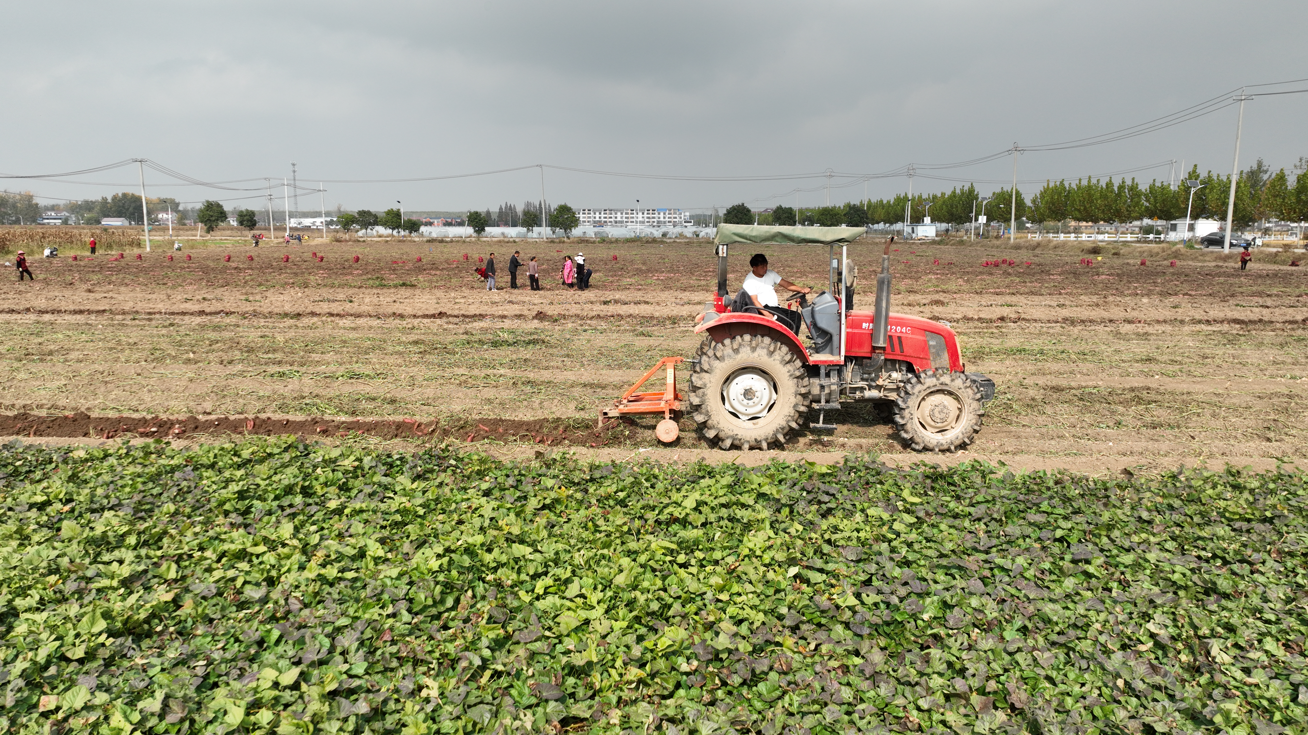 为了减轻劳力,当地村民利用机械进行收割。大型拖拉机所过之处,一垄垄红薯从泥土中翻滚而出,体态饱满、颜色鲜艳,整齐地排列在地里。经过短时间的晾干后,村民们剥掉红薯皮上的泥块,忙着分拣、装袋、运输,现场一派繁忙的情景。