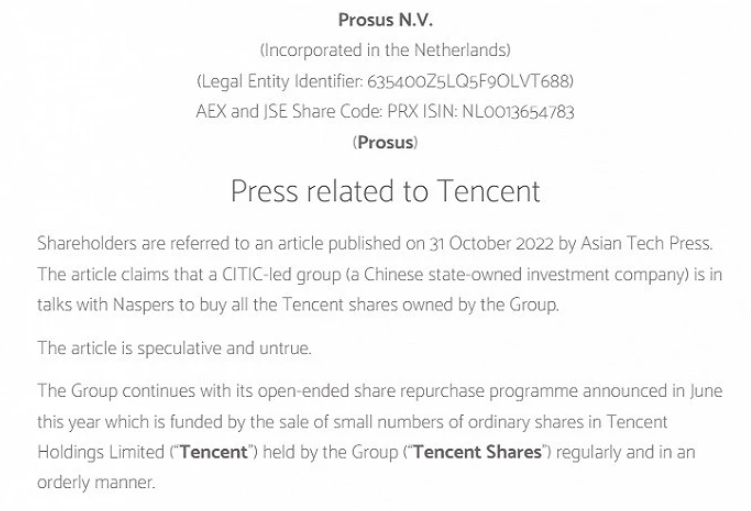 11月1日,腾讯控股(00700.HK)最大股东、南非Naspers集团荷兰子公司Prosus发布声明称,媒体公司“亚洲科技”(Asian Tech Press)10月31日文章称中信集团正组团与Naspers谈判以收购其持有的全部腾讯股份,该文是猜测性的,不符合事实。