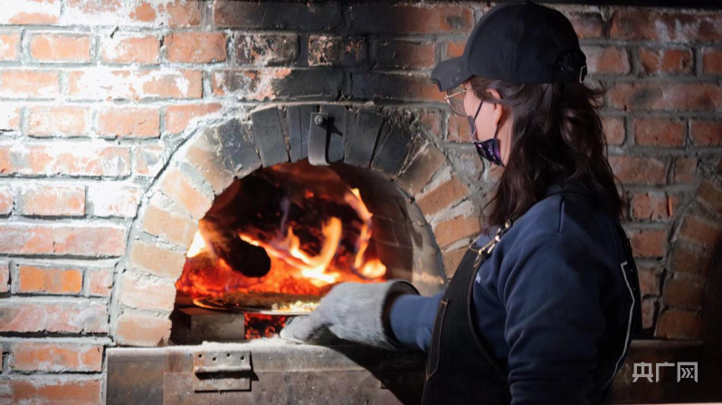 工作人员正在用桃木烤制披萨(央广网记者朱冠安摄)