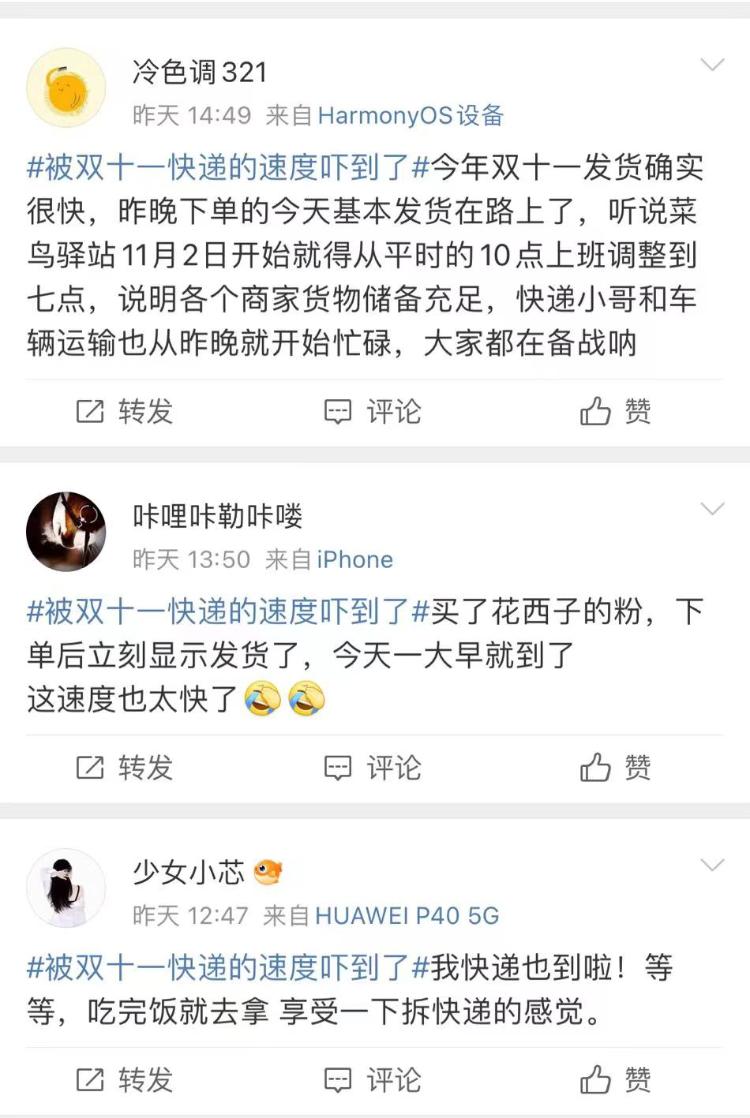 随着各大电商平台双十一大促的开始,不少网友惊奇地发现,今年的双十一快递明显提速,更有不少网友在社交平台上调侃称:“今年双十一快递神速,付完尾款第二天早上就收到货了,这是怕我退单的节奏吗?”记者注意到,相比往年双十一,今年各大快递公司的首单快递,更是被统一刷新到了分钟级别。