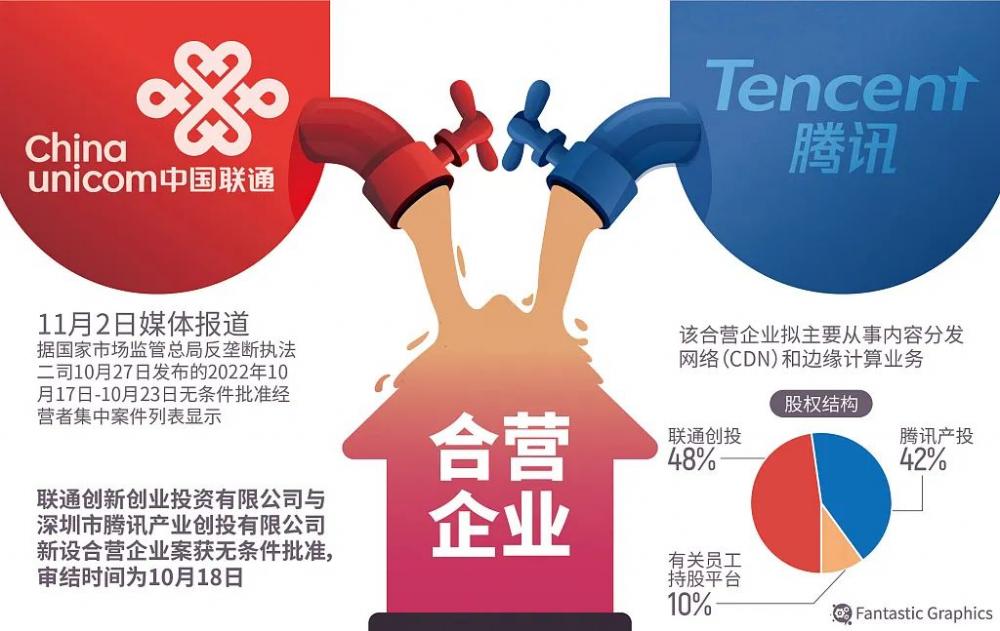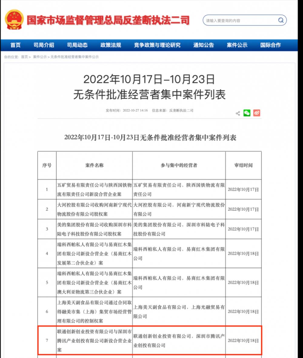 事情的起因是,国家市场监管总局反垄断二司于10月27日发布公示显示,联通创新创业投资有限公司(“联通创投”)与深圳市腾讯产业创投有限公司(“腾讯产投”)新设合营企业案获无条件批准,审结时间为10月18日。