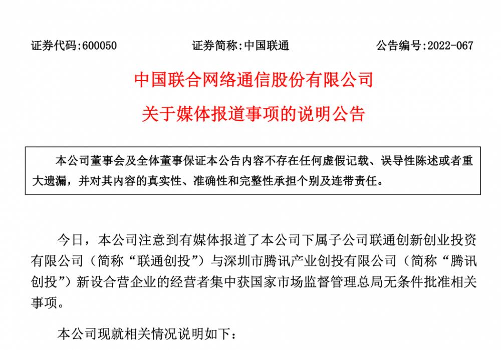 对于新设合营企业一事,中国联通于2日晚间发布公告,就相关情况进行说明: