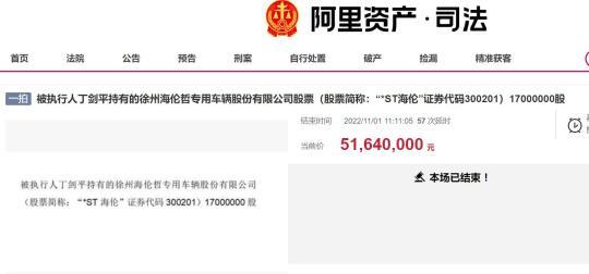 淘宝司法拍卖平台信息显示,机电公司持有的2164.5525万股、2238万股,拍卖价格分别为6498.72万元、6774.84万元;丁剑平持有的1700万股,拍卖价格则为5164万元。