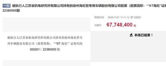 11月2日晚间,*ST海伦公告称,原控股股东江苏省机电研究所有限公司(下称“机电公司”)、丁剑平所持股份,将在淘宝司法拍卖平台公开拍卖,拍卖原因主要系一则借款合同纠纷案。