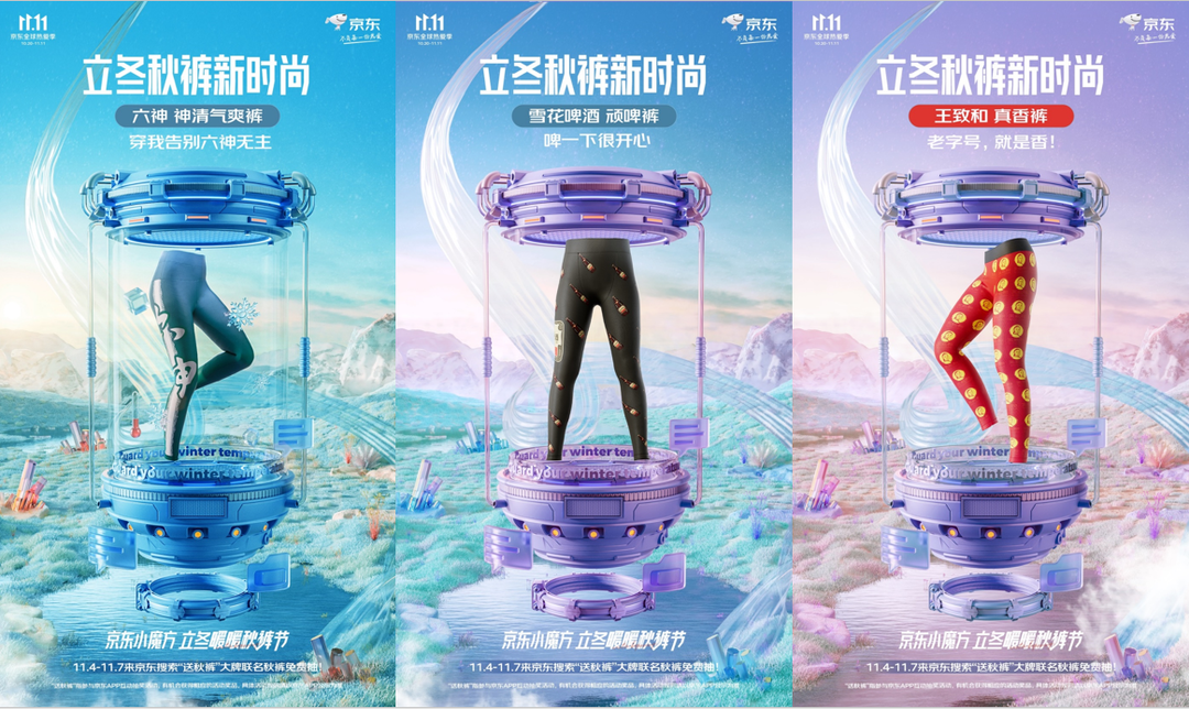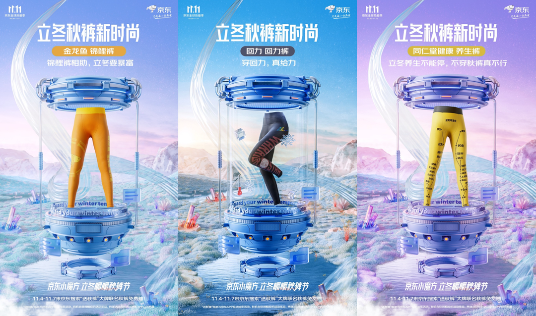 以京东11.11发起的“立冬暖暖秋裤节”为例,活动期间,京东携手同仁堂健康、回力、王致和、六神、金龙鱼、雪花啤酒等多家知名国货品牌,推出了多款联名秋裤。