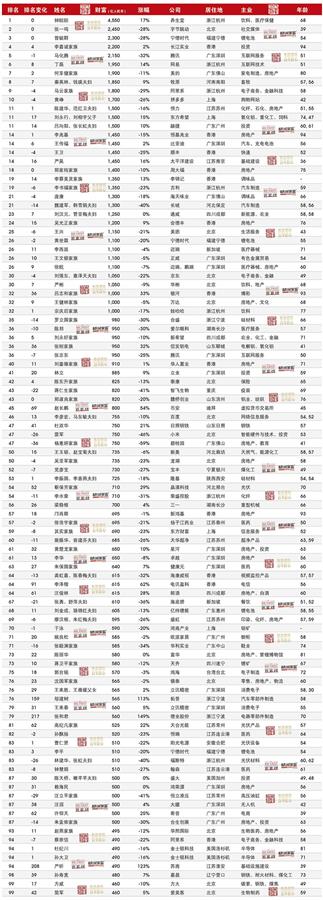 字节跳动39岁的张一鸣财富比去年下降950亿元,以2450亿元位列第二。宁德时代54岁的曾毓群财富比去年下降900亿元,以2300亿元位列第三。
