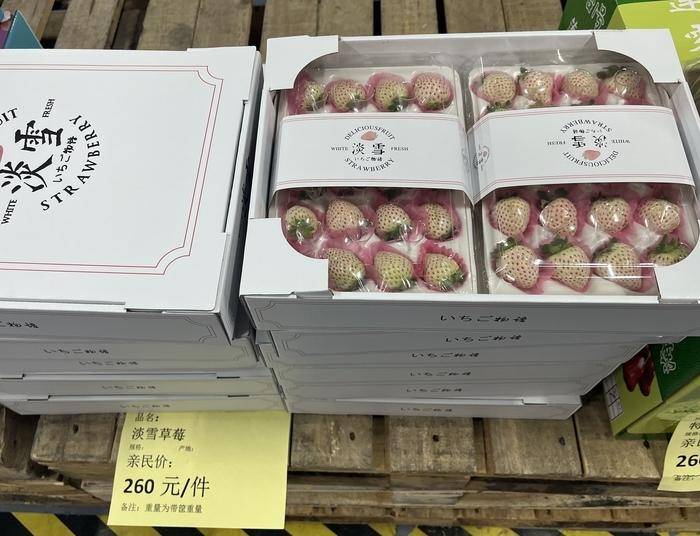 在八里桥周边一处专门销售果品的超市内,记者还见到了礼盒装的红色丹东草莓以及白色草莓。这类草莓的售价高达200余元/盒。一位工作人员介绍,这类草莓均是从外地运输而来,成本价较高。