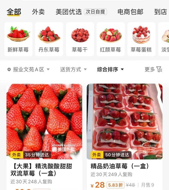 10日下午,记者检索团购平台发现,目前市面上的草莓品种以“双流草莓”“丹东草莓”和“张而草莓”为主,其销售价格也各不相同。市民除了可以在本地水果店购买草莓外,还可以通过平台订购草莓,多数跨市草莓支持物流隔天到货。