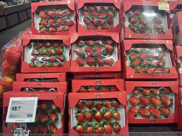 随后,记者又来到了市中区盒马鲜生超市,在超市内同样可以见到盒装草莓在售。其中,300克/盒的草莓售价为49.9元,其产地显示为山东济南。