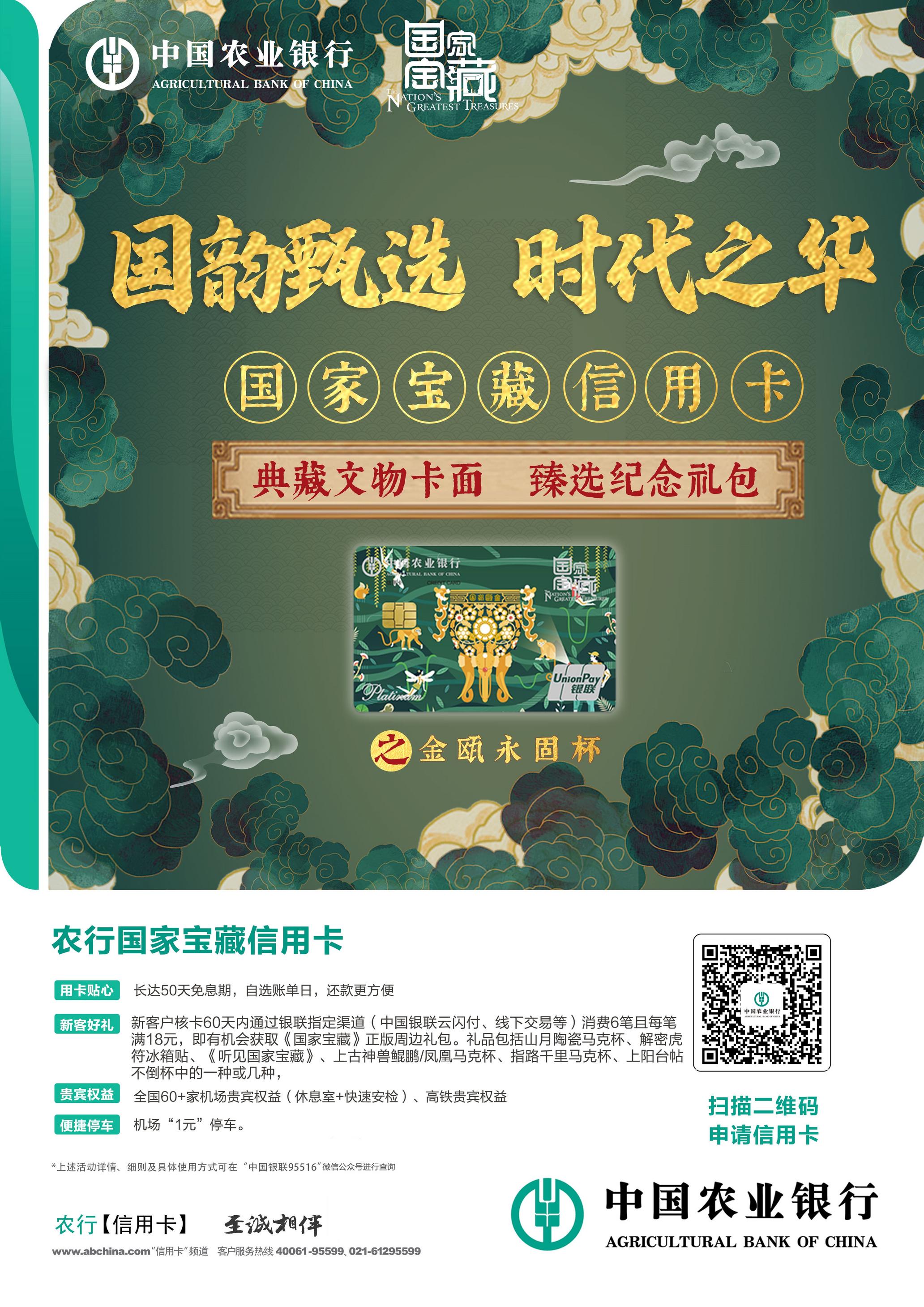 参评理由:国家宝藏卡是农业银行推出突出文化自信、中华优秀传统文化精华的“国潮”文化主题信用卡,首年发行量突破百万张。该产品卡面精美,产品设计以“国运甄选,时代之华”为主题,精选十余款国宝级文物作为卡面,采用特殊工艺,集文创消费、社交平台、便捷商旅、生活消费和创新支付为一体,展现 “国潮”魅力。同时该产品为新客户配套刷卡金、《国家宝藏》纪念礼品等多重好礼,深受广大客户好评。