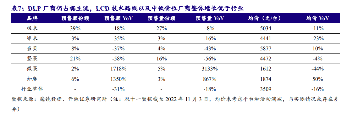 开源证券数据显示,今年双十一首轮预售中,投影仪预售额、预售量同比分别下降31%、18%。作为对比,2021年双十一投影仪整体预售额、预售量分别同比增长97%、55%。