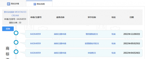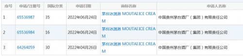 此外,茅台集团在第16类、第35类申请注册的第65536984号、65536987号“茅台冰淇淋MOUTAIICECREAM”商标,目前处于等待实质审查阶段。
