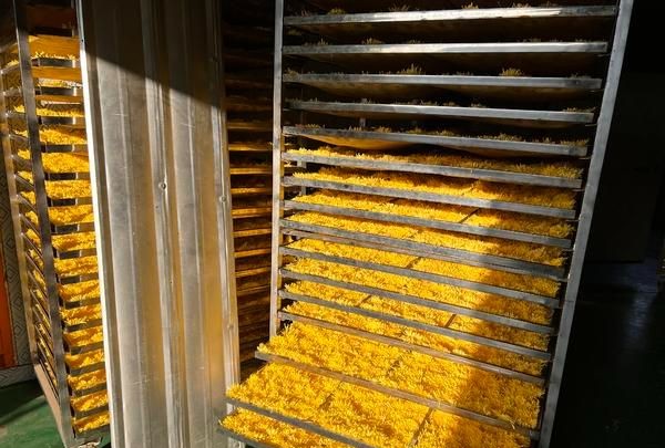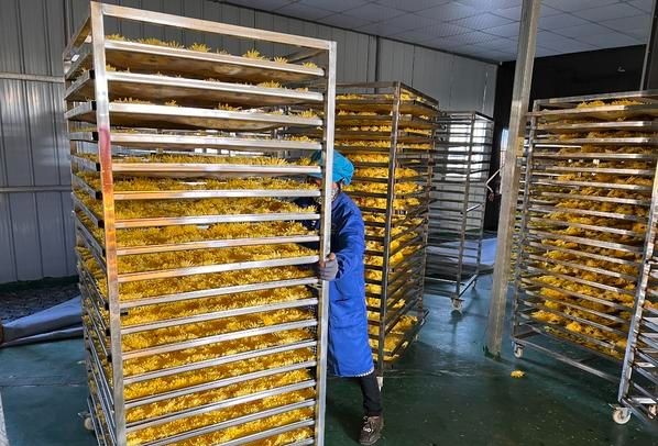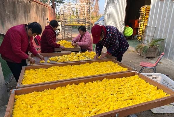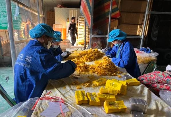工人们将采摘的新鲜菊花第一时间送到制茶车间,经过微波杀菌消毒、72小时低温烘干,再由人工分拣、包装成成品进入市场销售。