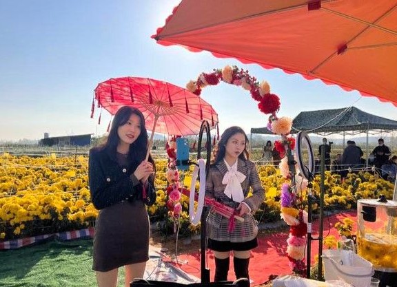在金丝皇菊基地,主播们或是现场直播为菊花茶吆喝,或是通过拍摄短视频、照片的形式吸引人气,现场热闹非凡。