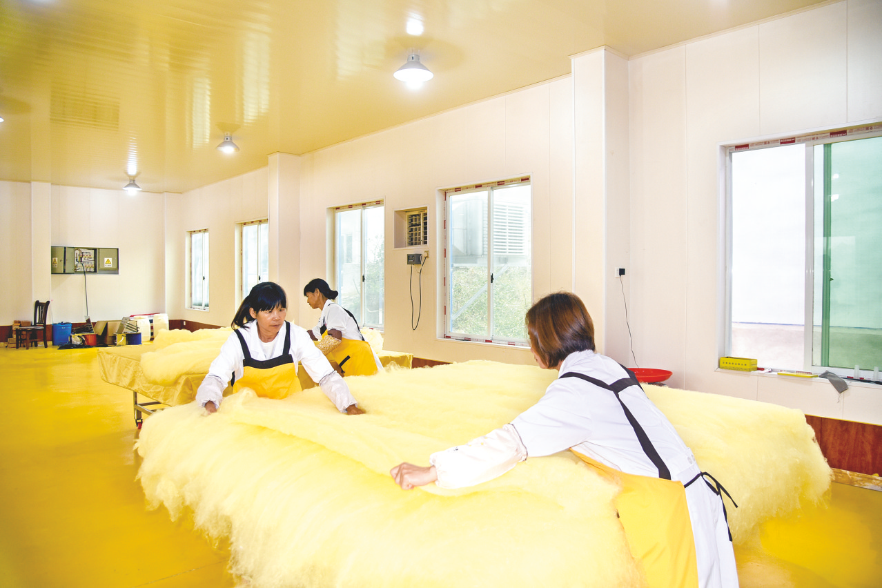 村民们精心制作蚕丝被。