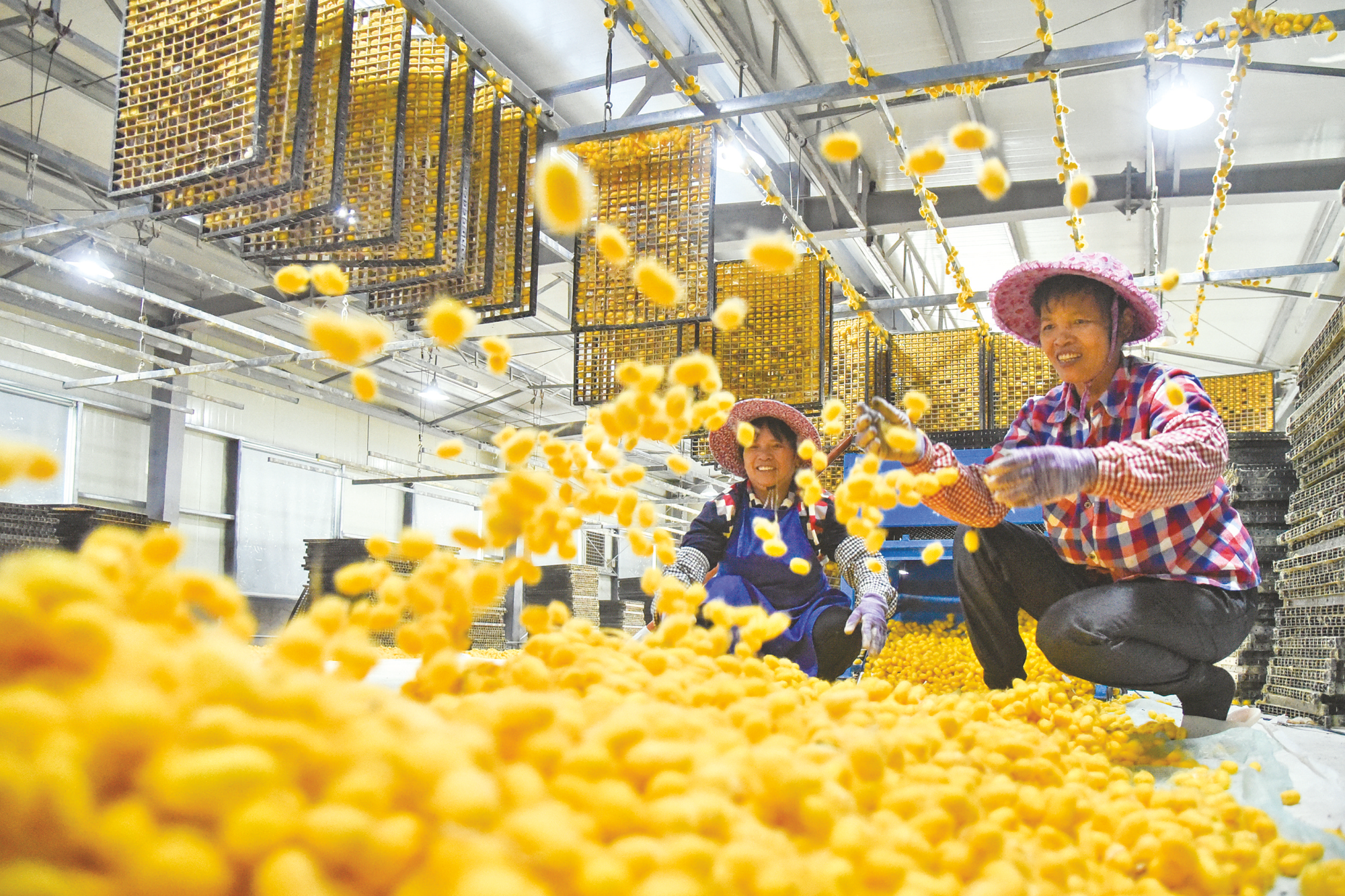 村民们采收“黄金茧”。记者黄红锦摄