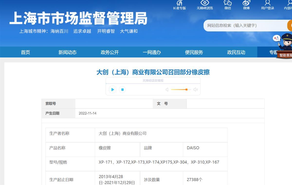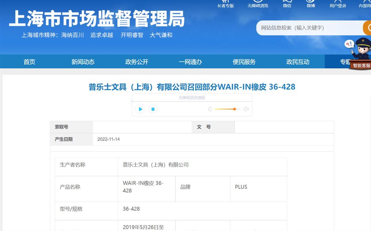 上海市市场监管局官网和官方微信公众号显示,此次召回的橡皮擦共约20.3万个,其中普乐士公司召回2019年5月26日至2021年5月28日期间生产的型号为36-428,共14个批次的“PLUS”WAIR-IN橡皮 36-428,涉及176000个;大创公司召回2013年4月28日至2021年12月29日期间生产的8种型号,共10个生产批号的“DAISO”橡皮擦,涉及27388个。