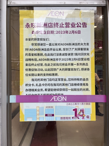 11月23日,《华夏时报》记者实地探访永旺新洲店时发现,店门口的玻璃门上张贴着该店终止营业的公告,公告显示:“我司因优化战略布局,AEON新洲店将于2023年2月6日营业结束后终止营业,在此之前我司将会开展一系列商品促销优惠活动,以此回馈广大的顾客朋友。”同时,公告还表示,其他门店均正常营业,消费者所持有的会员积分卡,礼品卡仍可在其他门店继续使用及办理相关业务。