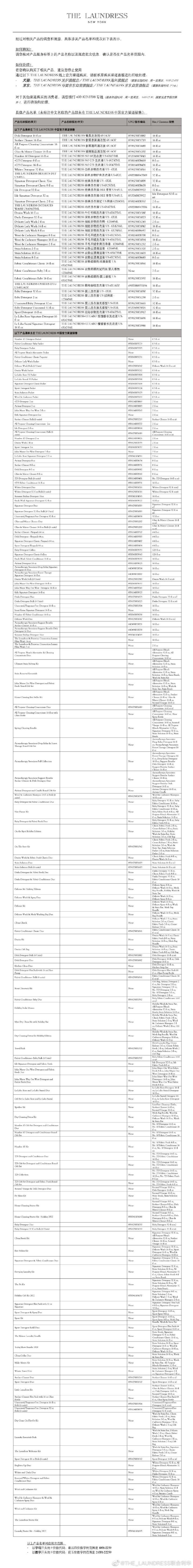 “THE_LAUNDRESS联合利华”官方微博发布的《产品召回公告》列出了涉及召回的具体产品和批次信息,并指出“请您核对产品瓶身标签上的产品名称以及瓶底批次信息”,并确认是否在产品名单范围内。
