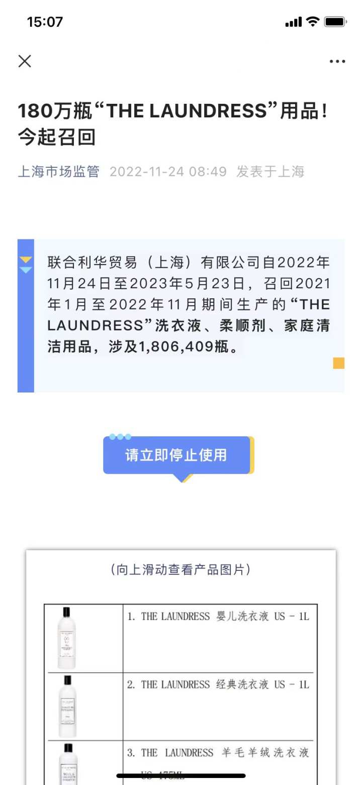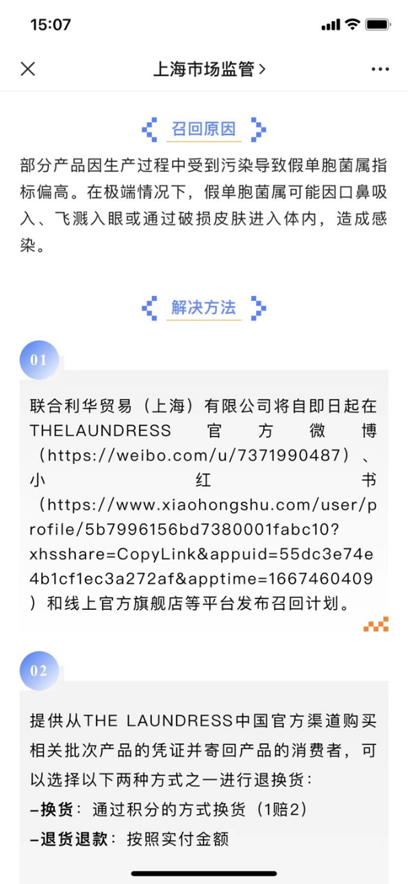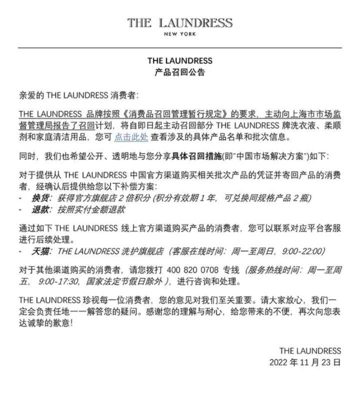 联合利华贸易(上海)有限公司已从即日起在THELAUNDRESS官方微博、小红书和线上官方旗舰店等平台发布召回计划。