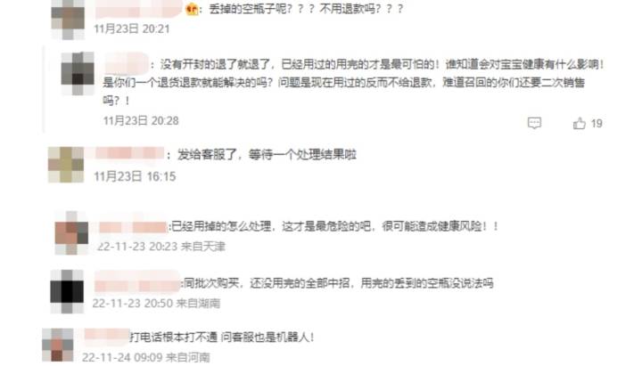 消息一出,已经丢掉使用完的空瓶子的网友,焦急询问,“已经用掉的怎么处理”“没有留下空瓶子怎么办?”还有网友表示“太难了”,400电话忙线,客服暂无回复。有网友表示,已经发给客服了,等待处理结果。