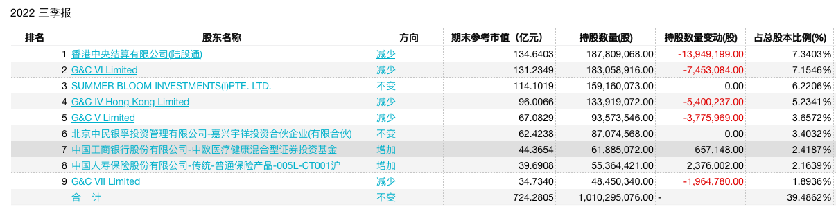 据药明康德三季度报披露,截至9月30日,药明康德的前十大流通股东中,有5名股东减持,其中排名首位的香港中央结算有限公司(陆股通)减持1394.92万股。而“千亿顶流”明星基金经理葛兰管理的中欧医疗健康混合基金小幅增持65.7148万股。截至报告期末,药明康德普通股东数量为30.3841万名,较半年报的21.6410增长近8.7万名。