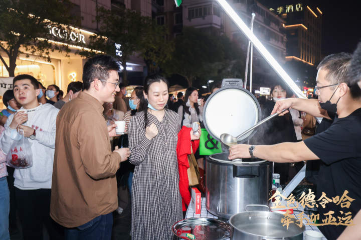 来自“德令哈·德到好物”的“王牌产品”——牦牛肉、羊肉成为了夜市的“排队王”。市民游客可以在现场免费品尝这些来自德令哈的原汁原味牦牛肉汤。