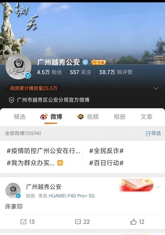 发稿前,并不能看到网传的广州越秀公安微博下相关“许家印”3个字还存在。