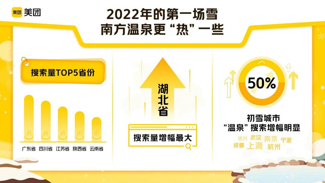 北方在炫雪糕的时候,南方在搜温泉。南京、武汉、杭州、成都、扬州、宁波等多个迎来初雪的城市,“温泉”相关搜索量环比增长均超过50%;而北半球首个冬季世界杯,也让很多人“边泡温泉边看世界杯”的愿望成真,“泡汤看球”等相关搜索量环比增幅超200%。“今年的雪来得比往年早一些,不停会有用户来问询、下单。”汤山一家温泉店的营销总监董女士告诉记者,“酒店共计有111间客房,本周末的入住率已几乎满员,而且不少人是来看球的,“我们在洗浴区域、休闲区域准备了投影仪、电视等设备,实时播放比赛,还根据今年市民的需求,增加了围炉煮茶套餐。”