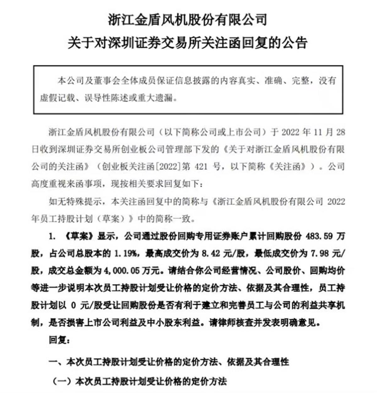 对此,11月28日,深交所发出关注函,要求金盾股份说明本次员工持股计划受让价格的定价方法、依据及其合理性,员工持股计划以0元/股受让回购股份是否有利于建立和完善员工与公司的利益共享机制,是否损害上市公司利益及中小股东利益。