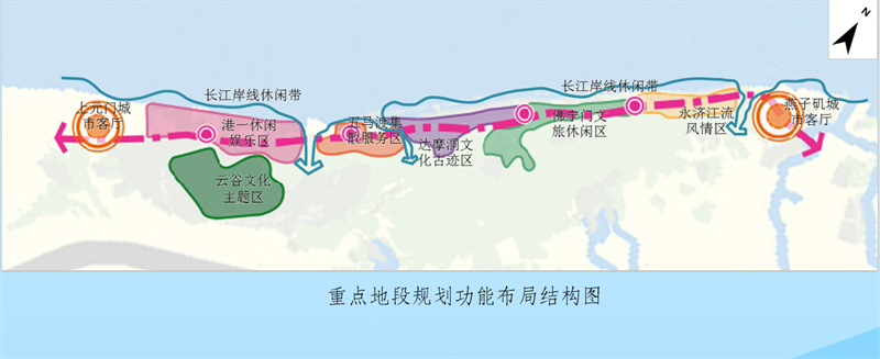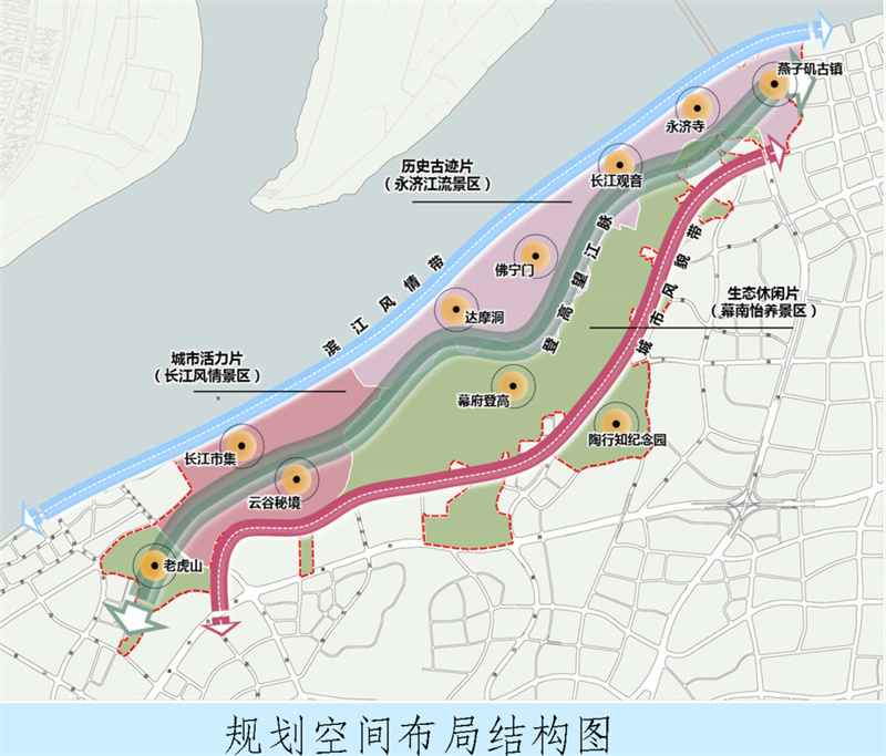 总体结构上,规划形成“一脉、两带、三片、十园”的总体空间布局结构。其中,滨江重点地段形成“一轴四节点,一带六片区”的功能布局结构。增加配套设施,规划三级旅游服务设施,其中规划一级旅游服务中心一处,位于滨江风情带西入口、港一地块内;规划二级旅游服务区三处,分别位于五马渡广场(风貌区水上入口)、燕子矶城市客厅(风貌区东部门户)、山南陶行知纪念馆附近;规划多处三级旅游服务点,在风貌区内灵活布置。