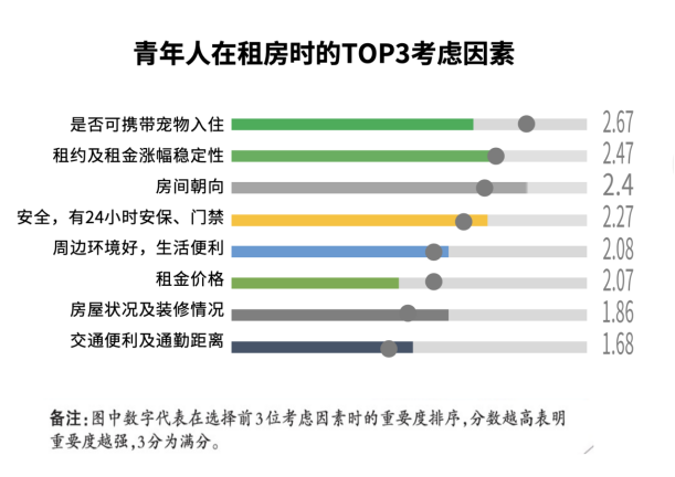 这表明越来越多的人会选择一只“萌宠”和自己共同生活。近日,ICCRA住房租赁产业研究院调研显示,当前青年人、新市民群体在考虑租房供给时排名前三的需求依次为:是否可以携带宠物入住、租约和租金的稳定性、房间朝向。可以同自己的宠物共同生活,成为Z世代在租住选择时首先会考虑的因素。