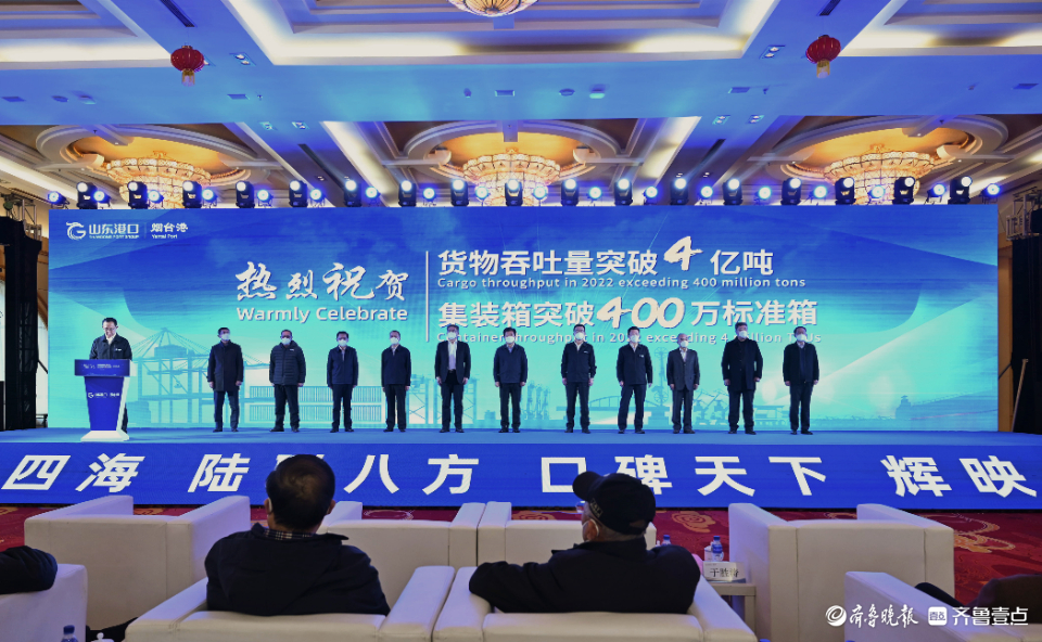 12月16日上午,“烟台港货物吞吐量突破4亿吨、集装箱突破400万标准箱”庆祝仪式在东山宾馆举行。