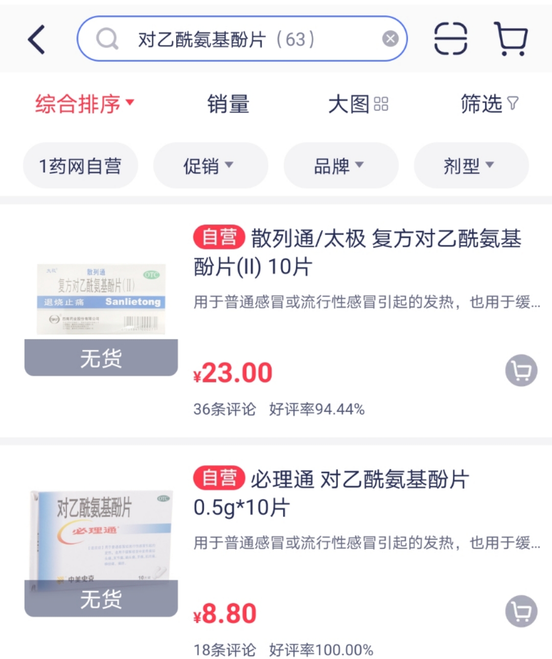 与同类药品对比,电商平台显示,散列通/太极复方对乙酰氨基酚片的售价为23元10片,必理通对乙酰氨基酚片的售价为8.8元10片,目前上述两种产品均已无货。泰诺林对乙酰氨基酚缓释片的价格为18片41.5元,显示缺货。