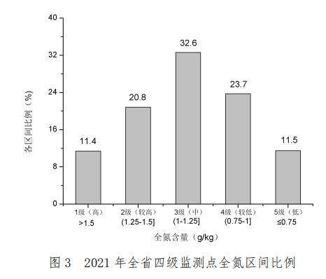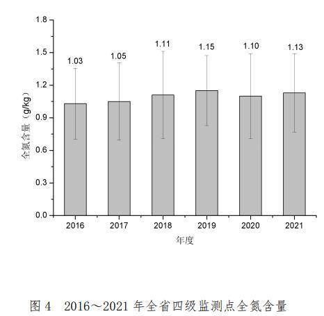 2021年全省四级监测点土壤全氮有效数据为3120个,平均含量1.13g/kg。2016~2021年,全省监测点土壤全氮平均含量在1.03g/kg-1.15g/kg间变化,分别为1.03g/kg、1.05g/kg、1.11g/kg、1.15g/kg、1.10g/kg、1.13g/kg,2021年较2016年增加9.7%。