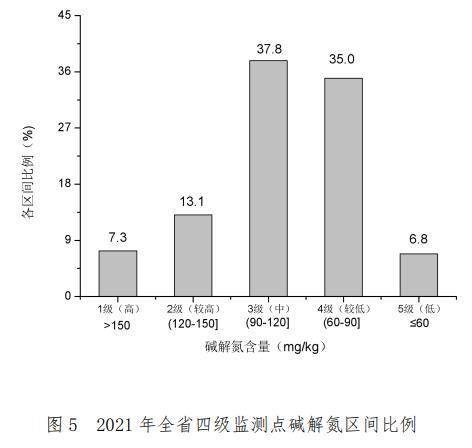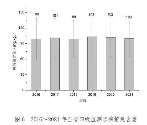 2021年全省四级监测点土壤碱解氮有效数据为2937个,平均含量100mg/kg。2016~2021年,全省土壤碱解氮平均含量在99mg/kg-103mg/kg间变化,分别为99mg/kg、101mg/kg、99mg/kg、103mg/kg、102mg/kg、100mg/kg,年际间变化不大。