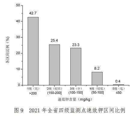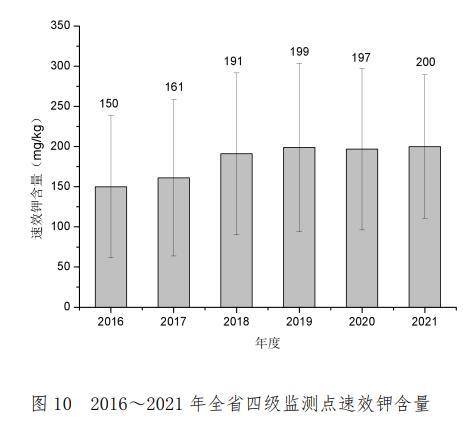 2021年全省四级监测点土壤速效钾有效数据为3203个,平均含量200mg/kg。2016~2021年,全省土壤速效钾平均含量分别为150mg/kg、161mg/kg、191mg/kg、199mg/kg、197mg/kg、200mg/kg,总体呈持续增加趋势,2021年较2016年增加33.3%。