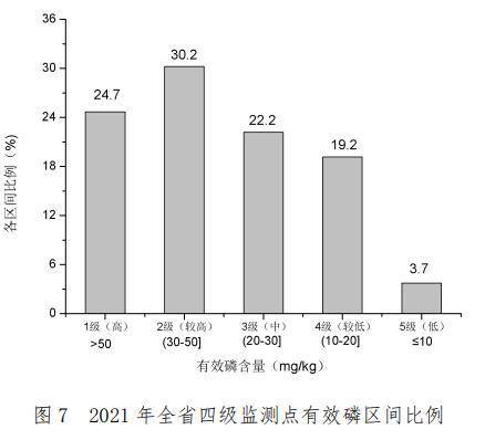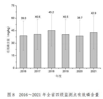 2021年全省四级监测点土壤有效磷有效数据为3215个,平均含量42.9mg/kg。2016年~2021年,全省监测点土壤有效磷平均含量分别为39.0mg/kg、40.6mg/kg、45.2mg/kg、40.5mg/kg、38.8mg/kg、42.9mg/kg,总体呈先升高后降低再升高趋势,2021年较2016年增加约10%。