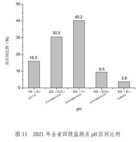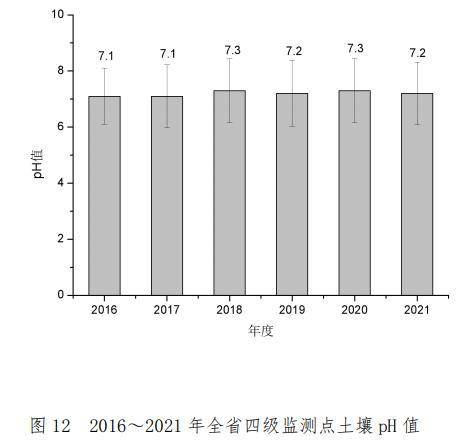 2021年全省四级监测点pH有效数据为2937个,平均值7.2。2016~2021年,全省土壤pH值分别为7.1、7.1、7.3、7.2、7.3、7.2,年际间变化不大,2021年较2016年增加0.1个单位。
