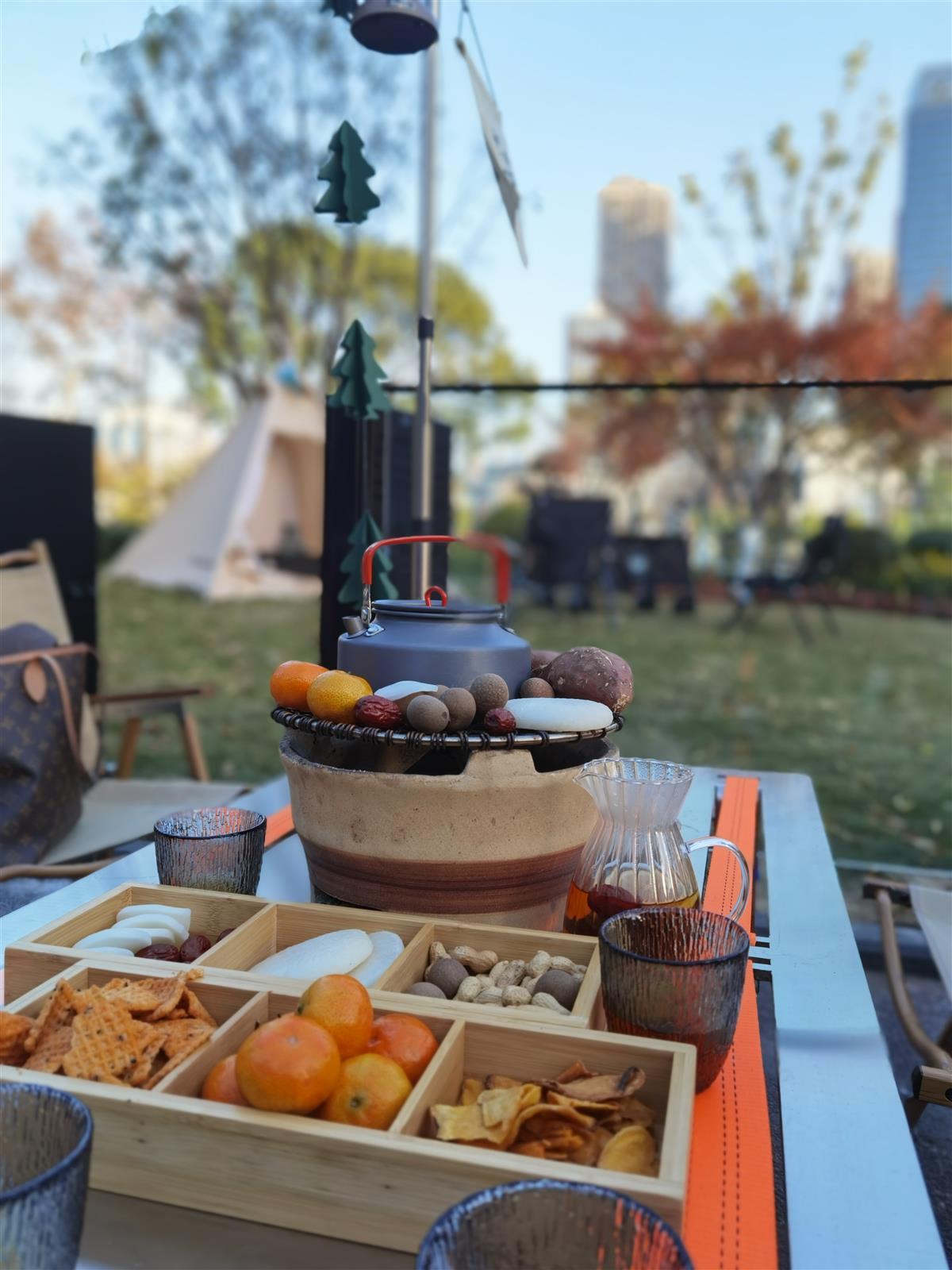 12月24日平安夜。在菱角湖公园的SOMA Bistro·餐酒吧外,95后白领杜琳和三五好友围坐在桌前,桌子上摆着陶罐、炉火、铁网烤盘,中间一壶热茶茶香四溢,外围摆上一圈栗子、橘子、柿子、红枣、年糕。