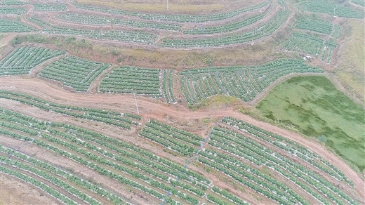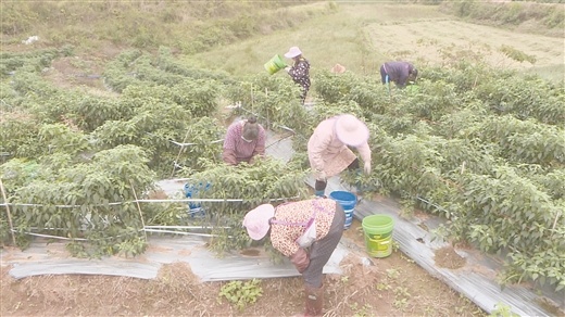在该县高峰镇上河村的辣椒种植基地,“椒农”在辣椒树间穿梭,手指熟练地一拈一掐,红彤彤的辣椒便摘了下来。高峰镇缺水,为了破解难题,基地引进水肥一体化灌溉系统。基地负责人成富立说:“我种了200亩辣椒,总产量60万公斤,产值230多万元。”