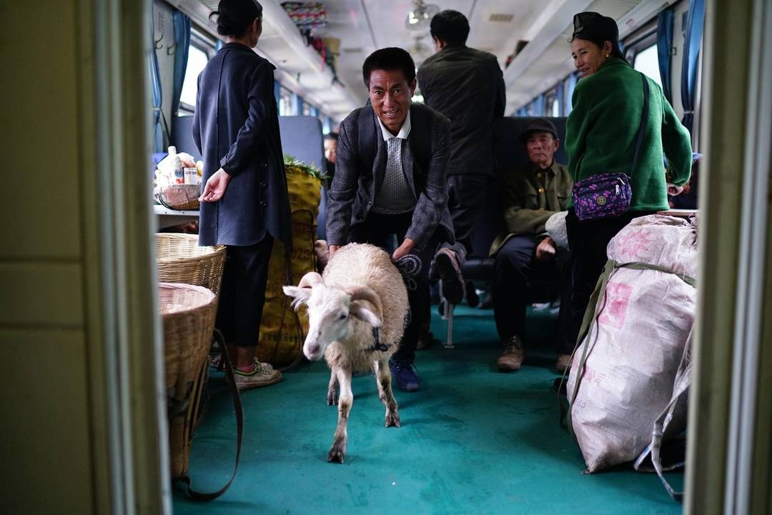 2019年7月,5634次列车上,一名乘客牵着羊上车。徐湘东摄