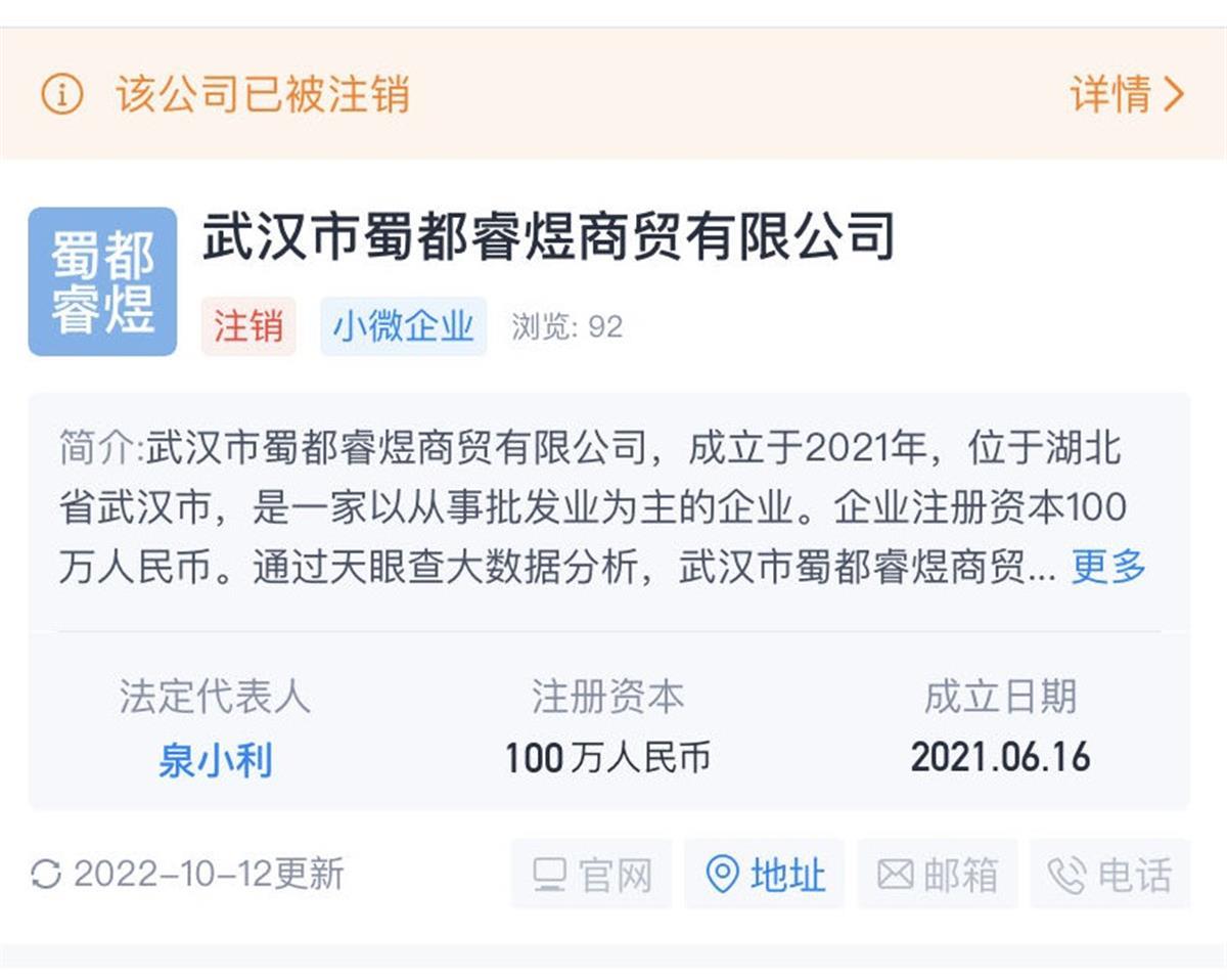 天眼查显示,武汉市蜀都睿煜商贸有限公司已被注销(天眼查截图)