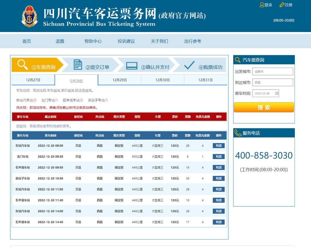 以12月28日为例,当天共有8班车从成都出发到西昌,其中东站汽车站3班、北门车站1班、石羊场车站3班、茶店子车站1班,票价为128元。截至记者发稿前,每班次都有剩余车票。